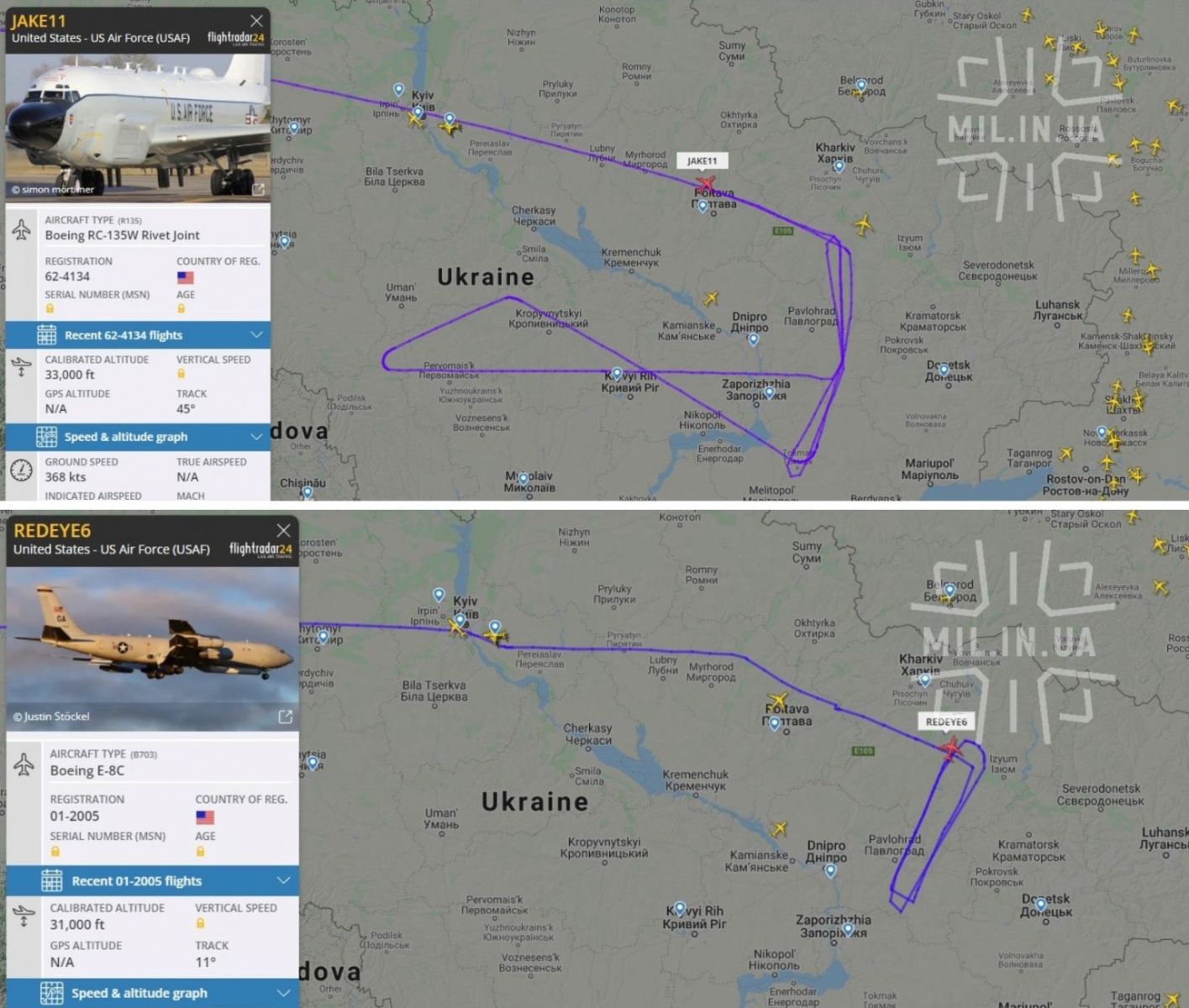 В то же время Boeing E-8C пролетел над столицей Украины, далее проследовал через Полтавскую область и совершил несколько кругов над границей Днепропетровской и Донецкой областей.