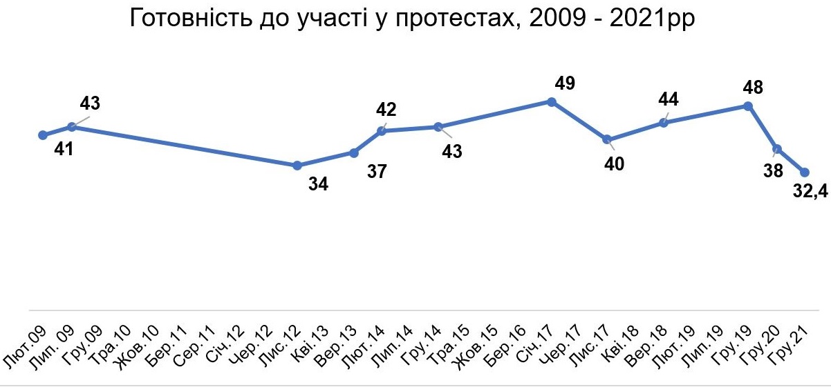 В декабре 2021 года в акциях протеста готовы участвовать 32,4% взрослых жителей Украины, в том числе: