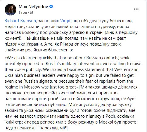 Брэнсон напомнил, что восемь лет назад, когда намерения Путина в отношении Украины стали очевидными для остального мира, он вместе с партнерами приложил усилия для мобилизации российских и украинских лидеров бизнеса для мирного урегулирования отношений.