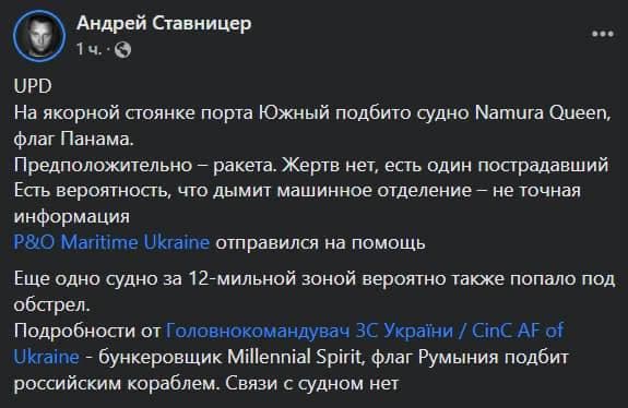 Впоследствии стало известно, что на якорной стоянке порта «Южный» военные РФ подбили еще одно судно Namura Queen (флаг Панама).
