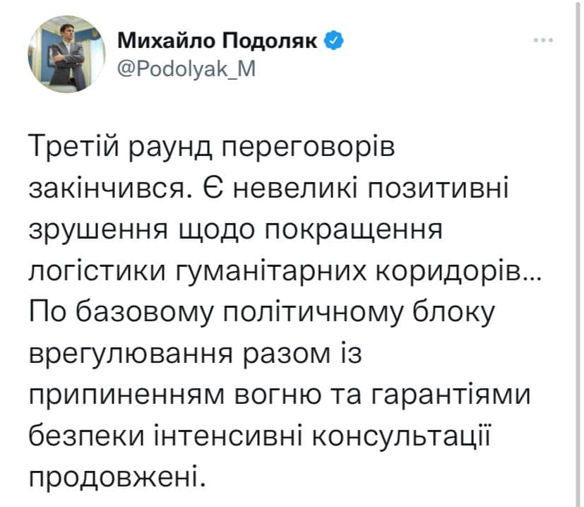 Третій раунд переговорів закінчився. Є невеликі позитивні зрушення щодо покращення логістики гуманітарних коридорів… По базовому політичному блоку врегулювання разом із припиненням вогню та гарантіями безпеки інтенсивні консультації продовжені. pic.twitter.com/wR0BYPkcVH