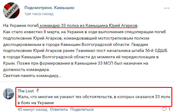 За наявними даними, командира було знищено під час бойових дій на Донбасі. Юрій Агарков раніше обіймав посаду начальника штабу 56-ї ОДШБ у місті Камишин Волгоградської області до моменту її передислокації в окупований Крим.