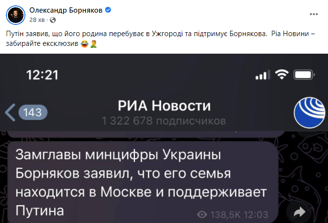 Путін заявив, що його родина перебуває в Ужгороді та підтримує Борнякова. РІА «Новости» — забирайте ексклюзив, — написав чиновник на власній Фейсбук-сторінці.