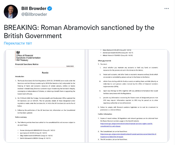 Абрамовичу заморозять активи, йому заборонять в’їжджати в країну, а також здійснювати операції з приватними особами та підприємствами Великої Британії. Дерипаска та Абрамович потрапляють під транспортні санкції, що означає заборону на перетин будь-яким російським повітряним судном британського кордону.