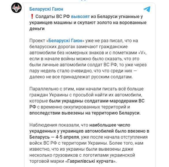 Такий висновок зробив проект «Беларускі Гаюн» на основі проведеного розслідування журналістів. Значна концентрація автомобілів, вкрадених у мирного населення України, спостерігається у Мозирі, Гомелі, Речиці, Наровлі, Хойніках та Єльську. Окрім цього, рашисти скуповують золото на поцуплені в українців гроші та розважаються у білоруських нічних клубах.