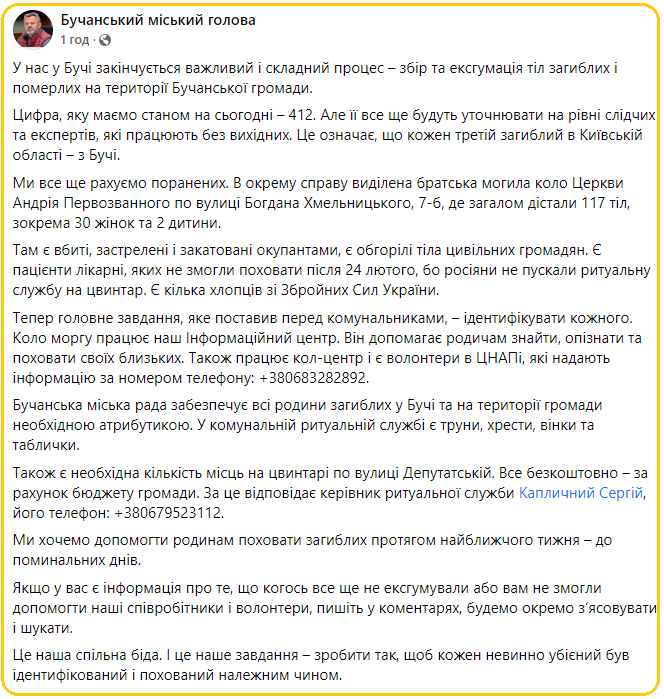У нас у Бучі закінчується ексгумація тіл загиблих і вбитих росіянами. Наразі виявили тіла 412 людей, — повідомив мер Анатолій Федорук.
