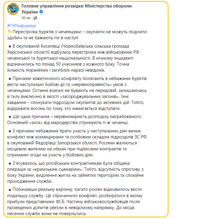 За даними розвідки, буряти не хочуть вести наступальні бойові дії та обурені «нерівноправністю» умов з чеченцями, які не бувають на передовій, а лише забирають собі всю награбовану здобич.