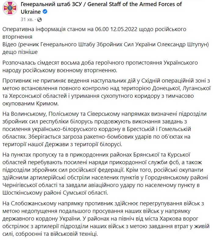 https://racurs.ua/n170574-genshtab-vsu-nazval-napravleniya-gde-rf-vedet-aktivnoe-nastuplenie.htmlРакурсВійна рф проти України триває. росія веде активний наступ на Сході і Півдні України задля встановлення повного контролю над територією Донецької, Луганської та Херсонської областей й утримання сухопутного коридору з окупованим Кримом. Про це йдеться у зведенні Генерального штабу Збройних сил України, оприлюдненому 12 травня у Фейсбук.