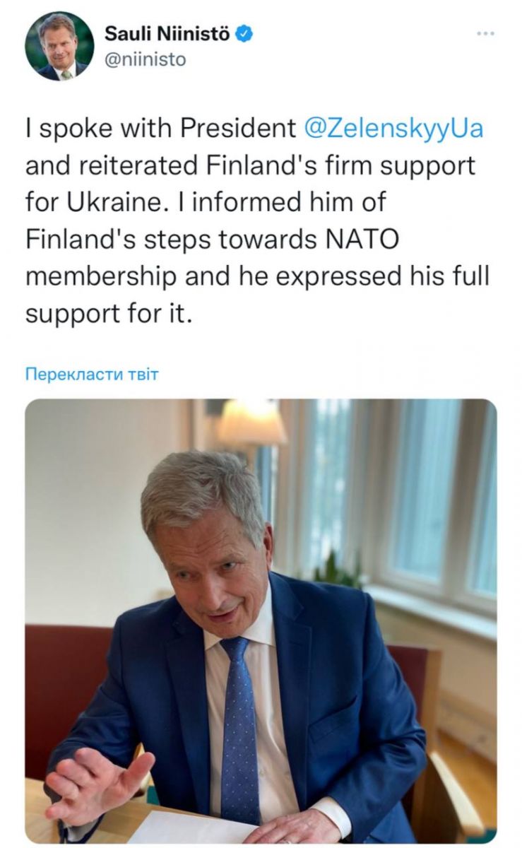 Був потрібен час для тісних міжнародних контактів як з НАТО, так і з країнами-членами, а також зі Швецією. Ми хотіли надати обговоренню необхідний простір… Тепер, коли наближається час прийняття рішень, ми також висловлюємо нашу спільну позицію до відома депутатських груп і партій. Членство в НАТО посилило б безпеку Фінляндії. Як член НАТО, Фінляндія зміцнить весь оборонний альянс. Фінляндія має терміново подати заявку на членство в НАТО, — йдеться у заяві Нііністьо та Марін.