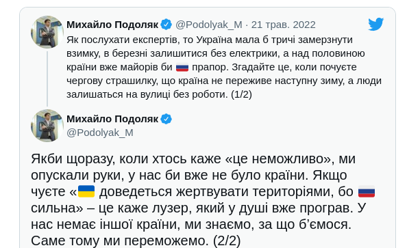 Якби щоразу, коли хтось каже «це неможливо», ми опускали руки, у нас би вже не було країни. Якщо чуєте «Україні доведеться жертвувати територіями, бо росія сильна» — це каже лузер, який у душі вже програв. У нас немає іншої країни, ми знаємо, за що бʼємося. Саме тому ми переможемо, — написав Подоляк у Twitter.