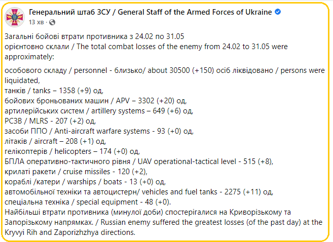 Загальні бойові втрати ворога з 24 лютого по 31 травня орієнтовно склали: