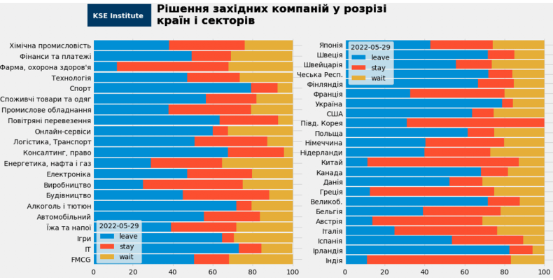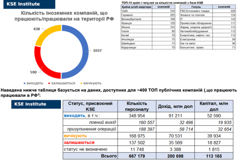 Станом на 29 травня, KSE Institute вдалося ідентифікувати позицію щодо роботи на ринку рф близько 2 тис. 65 компаній і організацій з 70 країн та 55 галузей. Також аналітики визначили орієнтовно 400 публічних груп компаній та їхній операційний бізнес в рф. Вартість інвестованого в росію капіталу становить близько 113 млрд дол., а локальна виручка 200 млрд дол. Персонал компаній складає 700 тис. осіб.