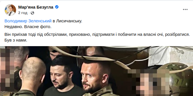 https://racurs.ua/n171900-zelenskiy-tayno-posetil-lisichansk-zayavili-v-sluge-naroda-foto.htmlРакурсНародний депутат України Мар’яна Безугла повідомила, що нещодавно Володимир Зеленський таємно відвідав Лисичанськ.