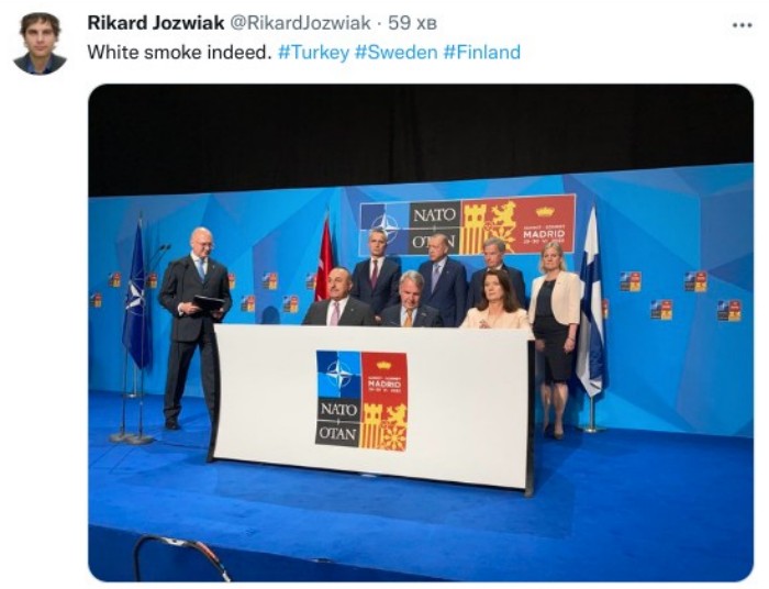 Білий дим (аналогія із завершенням процедури обрання нового Папи Римського — ред.) від Туреччини. Швеція і Фінляндія будуть в НАТО, — зазначив він.