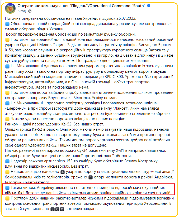 Захисники України повідомили, що авіація ЗСУ завдала чотири удари по опорних пунктах воєнних злочинців росії в районі Андріївки, Білогірки і Благодатного, що дало змогу вибити окупантів з двох населених пунктів.