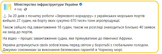 https://racurs.ua/n173914-za-20-dney-iz-portov-vyshli-27-suhogruzov-18-zashli-mininfrastruktury.htmlРакурсПерші результати угоди щодо експорту зерна оприлюднило Міністерство інфраструктури України. За 20 днів з початку роботи «зернового коридору» з українських морських портів вийшло 27 суден, на борту яких було сукупно 670 тис. тонн агропродукції.