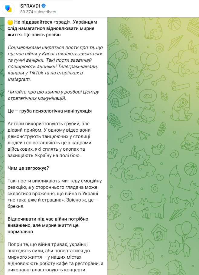 суперечки між українцями про те, що хтось дозволяє собі відпочивати, поки інші воюють, лише грають на руку росіянам. Як і будь-які інші конфлікти всередині нашого суспільства. Саме вороги хотіли би бачити нас у постійному страху та захованими по підвалах;