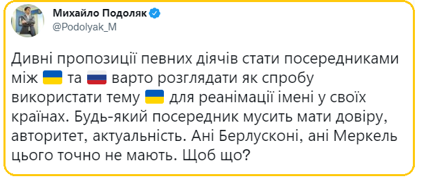 Дивні пропозиції певних діячів стати посередниками між Україною та росією варто розглядати як спробу використати тему України для реанімації імені у своїх країнах. Будь-який посередник мусить мати довіру, авторитет, актуальність. Ані Берлусконі, ані Меркель цього точно не мають, — написав у Твіттер радник глави Офісу президента Михайло Подоляк.