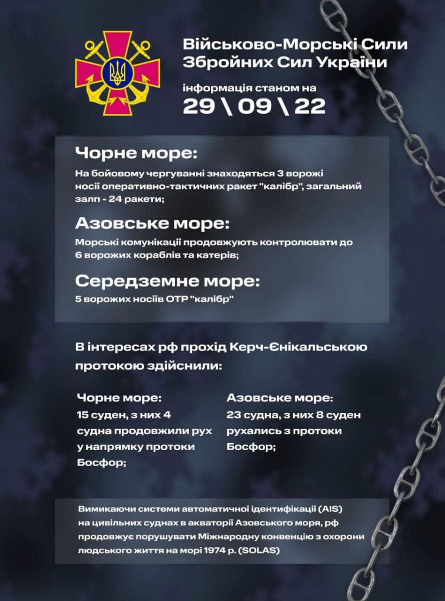 Зазначається, що 28 вересня в інтересах країни-агресора прохід Керч-Єнікальською протокою до Азовського моря здійснили 23 судна, з них вісім суден рухалось з протоки Босфор. До Чорного моря рухалися 15 суден, з них чотири судна продовжили рух у напрямку протоки Босфор.