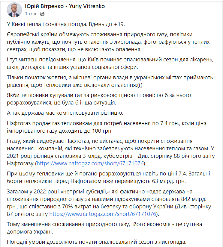 У Києві тепла і сонячна погода. Вдень до +19. Європейські країни обмежують споживання природного газу, політики публічно кажуть, що почнуть опалення з листопада, фотографуються у теплих светрах, щоб показати, що не включають опалення. І тут читаєш повідомлення, що Київ починає опалювальний сезон для лікарень, шкіл, дитсадків та інших установ соціальної сфери. Тільки початок жовтня, а місцеві органи влади в українських містах приймають рішення, щоб тепловики вже включали опалення, — вказав Вітренко.