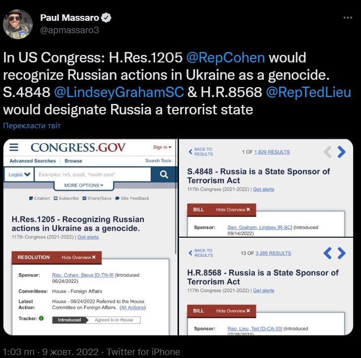 Також до Конгресу внесли законопроєкт конгресмена Стіва Коена (Демократична партія) про визнання дій рф в Україні геноцидом.