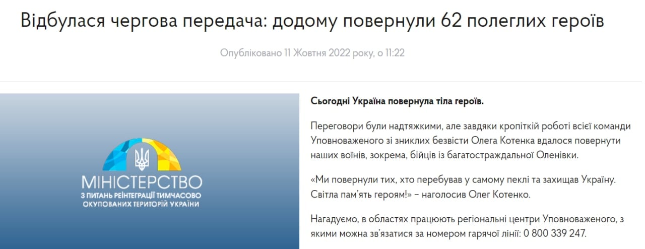 За словами Уповноваженого зі зниклих безвісти Олега Котенка, переговори з країною-терористом були надтяжкими, але завдяки кропіткій роботі всієї команди вдалося повернути наших воїнів, зокрема, бійців із багатостраждальної Оленівки.