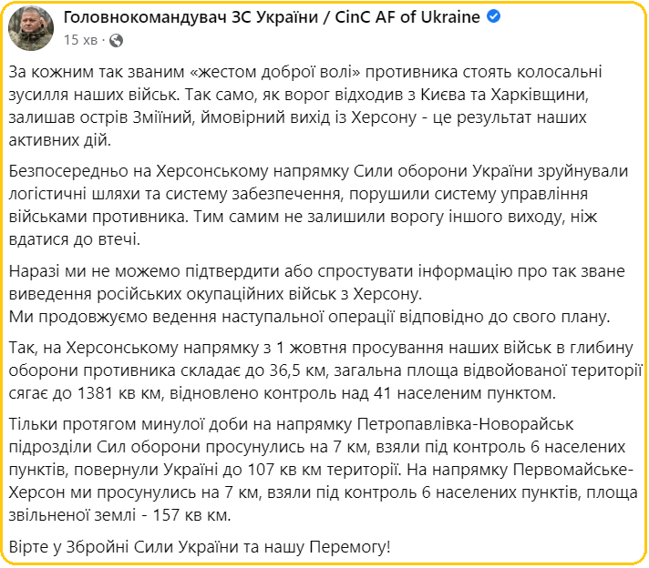 З його слів, на херсонському напрямку з 1 жовтня просування наших військ в глибину оборони противника складає до 36,5 кілометрів. Загальна площа відвойованої території сягає до 1 тис. 381 кв. км. ЗСУ відновило контроль над 41 населеним пунктом.