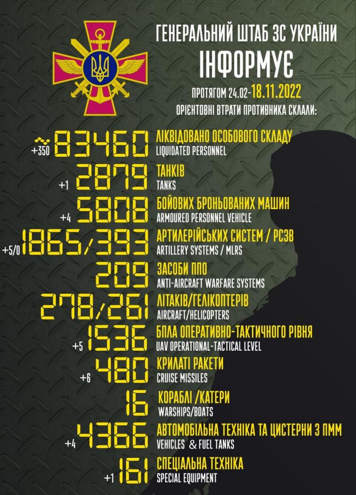 https://racurs.ua/n176916-350-rashistov-unichtojili-zaschitniki-ukrainy-za-sutki-infografika.htmlРакурсРосійські загарбники за час повномасштабного вторгнення в Україну втратили вже 83 тис. 460 осіб.