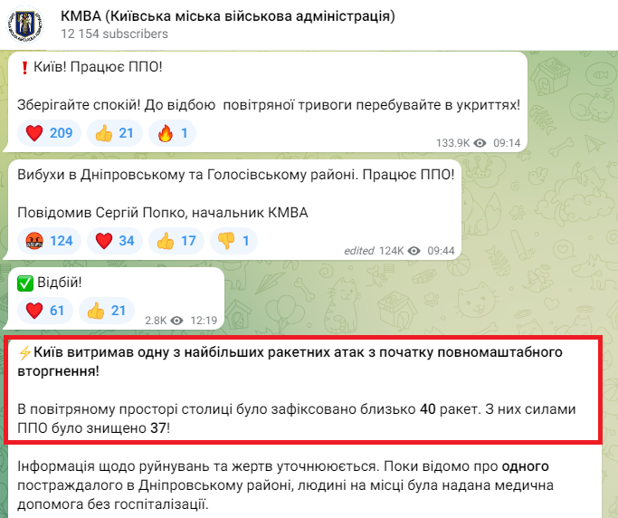 Київ витримав одну з найбільших ракетних атак з початку повномаштабного вторгнення! В повітряному просторі столиці було зафіксовано близько 40 ракет. З них силами ППО було знищено 37! — повідомляє Telegram-канал Київської міської військової адміністрації.