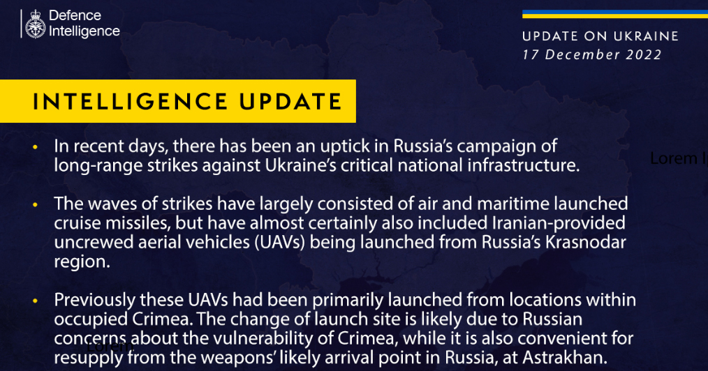 Тепер ці безпілотники для атак по Україні ворог запускає з краснодарського краю росії. Саме звідти були здійснені останні запуски. Зазвичай окупанти запускали «Шахеди» з території окупованого півострова. Про це 17 грудня повідомило Міністерство оборони Великої Британії в Twitter.