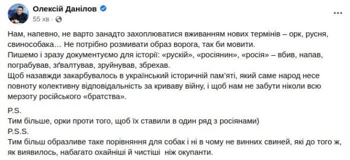 Пишемо і зразу документуємо для історії: «рускій», «росіянин», «росія» — вбив, напав, пограбував, зґвалтував, зруйнував, збрехав, — наголошує Данілов. — Щоб назавжди закарбувалось в український історичній пам’яті, який саме народ несе повноту колективну відповідальність за криваву війну, і щоб нам не забути ніколи всю мерзоту російського «братства».