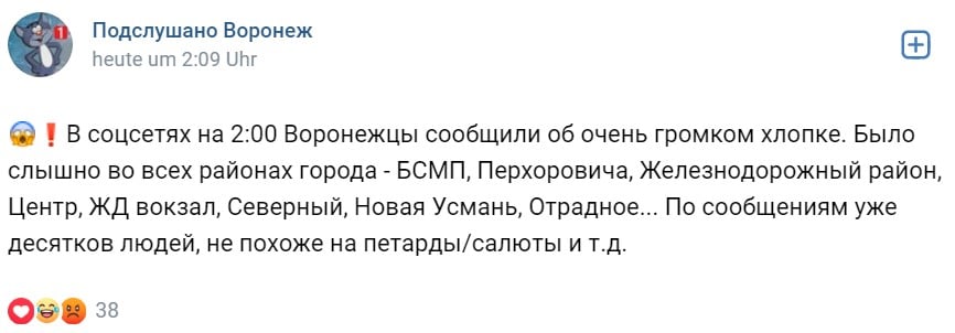 Російські соцмережі пишуть, що 2 січня приблизно о 01.37 в Воронежі пролунало щонайменше два вибухи. У пабліках соцмереж місцеві виклали ролики з вуличних камер спостереження та фото заграви на горизонті. Чутно й сирену повітряної тривоги з боку аеродрому — про це говорить автор відео, викладеного в заборонену в Україні соцмережу ВКонтакте.