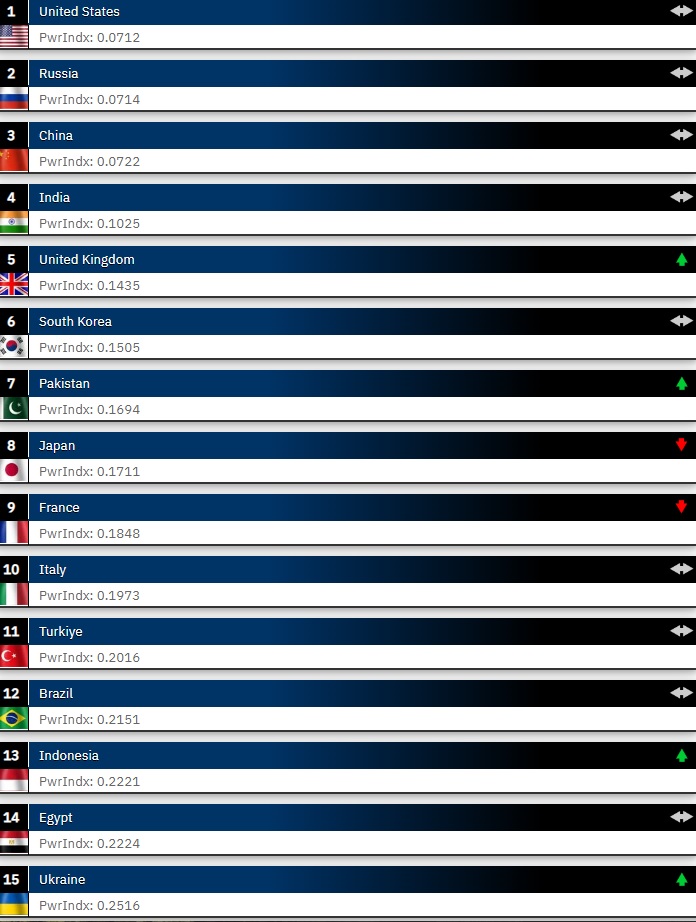 Керуючись 60 окремими чинниками визначення оцінки для армії кожної країни, експерти проаналізували військовий потенціал 145 світових держав. Зверніть увагу на першу двадцятку списку — Україна піднялася на 15 місце, хоча на початку 2022 року посідала 22 рядок рейтингу, — повідомляють у Страткомі ЗСУ.