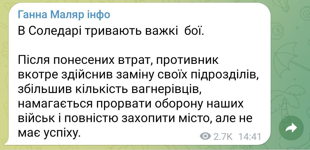 У Соледарі тривають важкі бої. Після втрат противник вкотре провів заміну своїх підрозділів, збільшив кількість вагнерівців, намагається прорвати оборону наших військ та повністю захопити місто, але успіху не має, — написала Маляр вдень у середу, 11 січня.