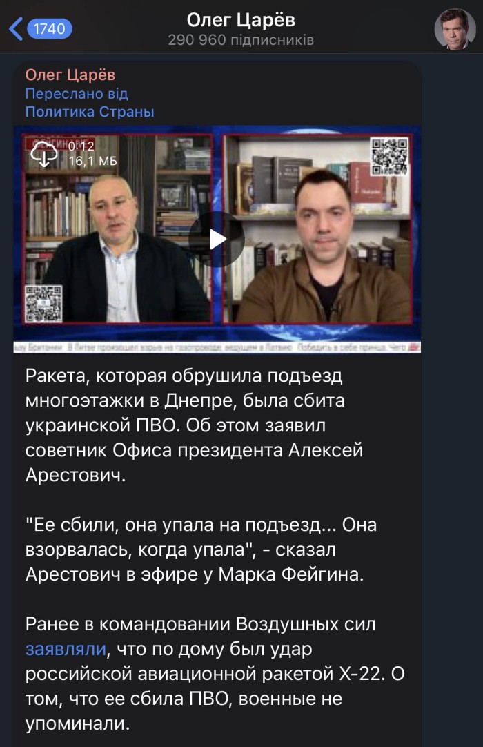 https://racurs.ua/n178869-arestovich-zayavil-chto-na-dom-v-dnepre-upala-sbitaya-pvo-raketa-video-incidenta-eto-oprovergaet.htmlРакурсОлексій Арестович, радник Офісу президента, в ефірі одного з YouTube-каналів заявив, що ракета, котра знищила під’їзд багатоповерхівки у Дніпрі, була збита силами ППО та вибухнула при падінні.