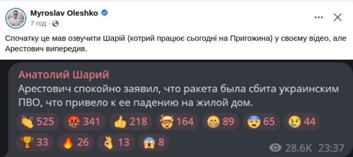 Заяву Арестовича відразу підхопила російська пропаганда, котра ракетні удари по цивільних цілях в Україні традиційно намагається видати за наслідки роботи сил ППО України.