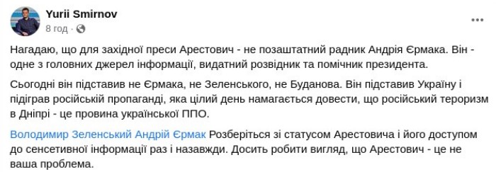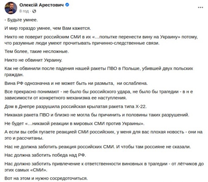 Пізніше Арестович оприлюднив пост, у якому не заперечив сказане раніше, проте заявив, що «розумні люди вміють прочитувати причинно-наслідкові зв’язки».