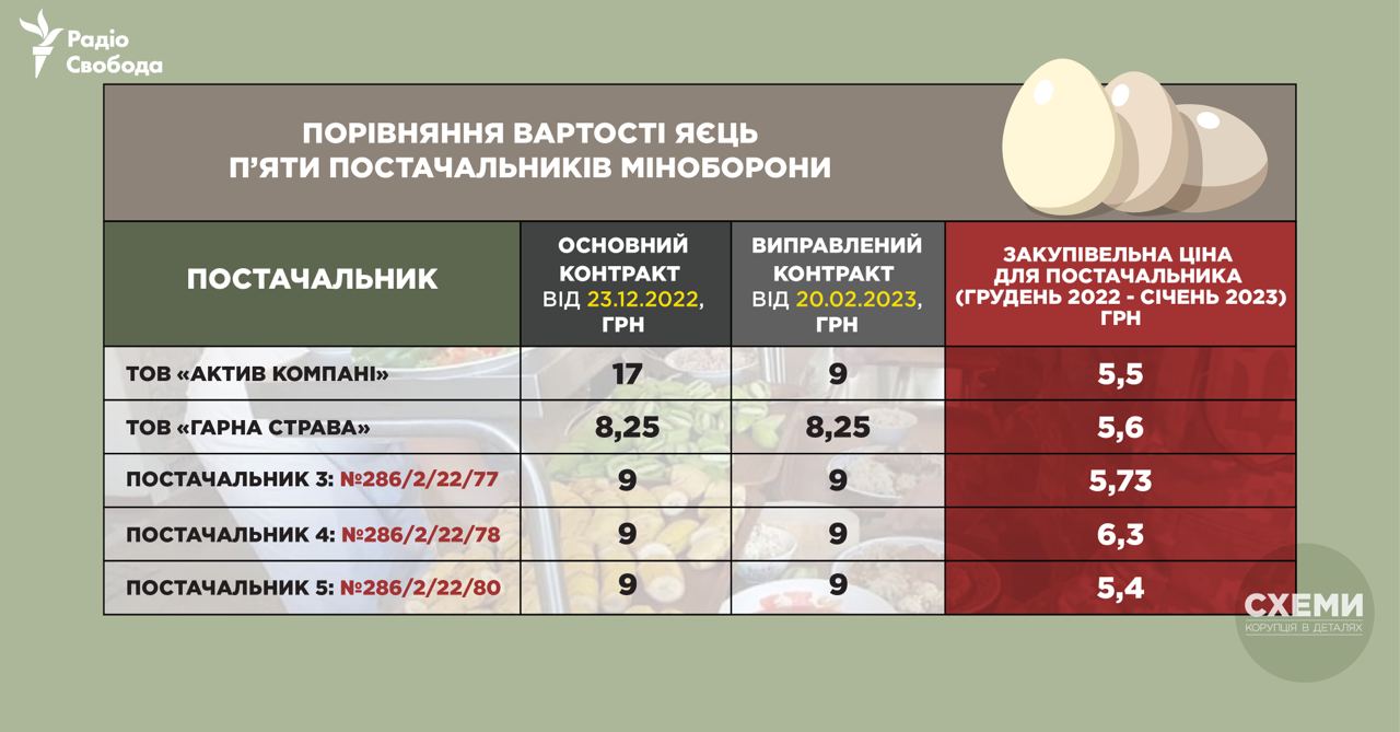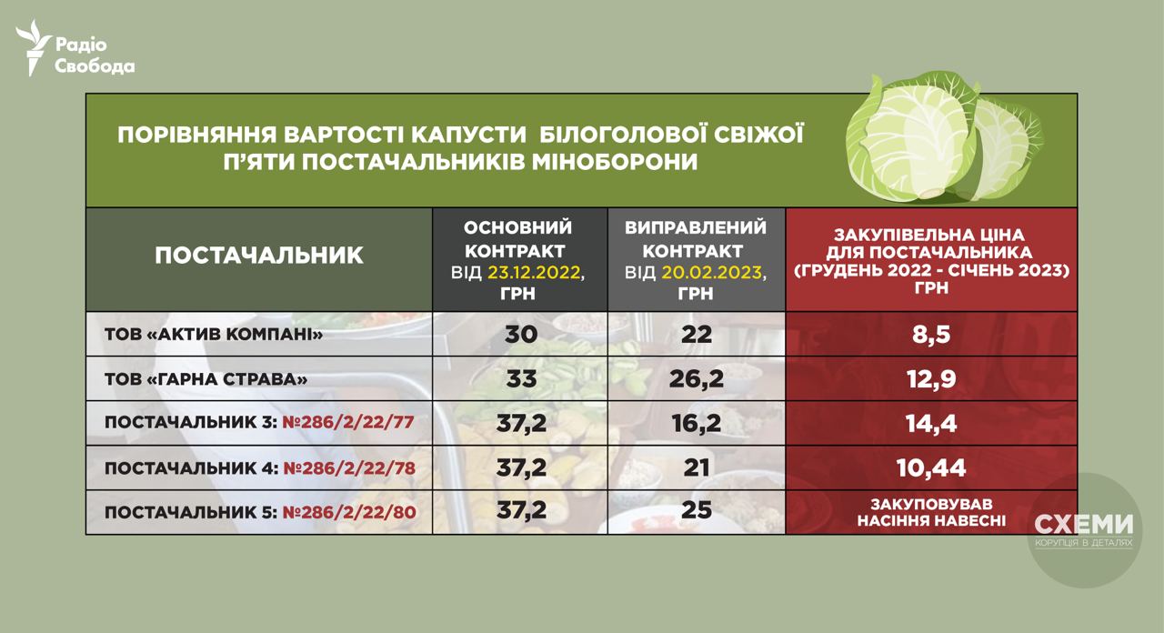 Порівняння цін «Схеми» наводять в інфографіці. На прохання Міноборони назви деяких постачальників не публікують.