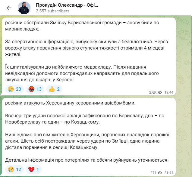 Ввечері три удари ворожої авіації зафіксовано по Бериславу, два — по Новобериславу та один — по Козацькому. Нині відомо про сімох жителів Херсонщини, поранених внаслідок ворожої атаки, — повідомив очільник Херсонської обласної військової адміністрації Олександр Прокудін.