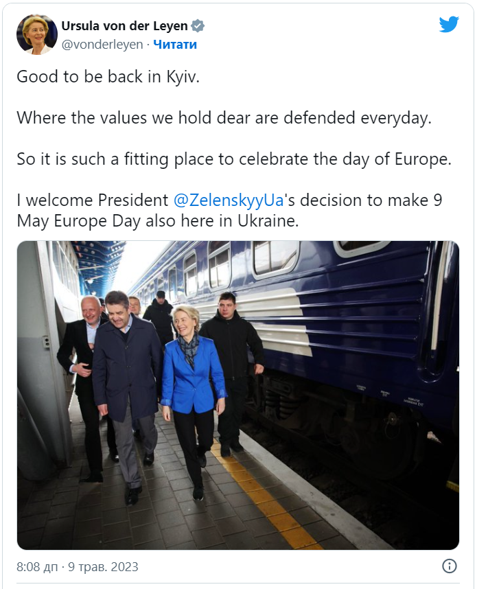 Тому це дуже доречне місце для святкування Дня Європи. Я вітаю рішення президента Володимира Зеленського зробити 9 травня Днем Європи також і тут, в Україні, — зауважила фон дер Ляєн.