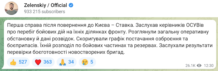 Перша справа після повернення до Києва — Ставка. Заслухав керівників Об'єднаних стратегічних угруповань військ про перебіг бойових дій на їхніх ділянках фронту. Розглянули загальну оперативну обстановку й дані розвідок. Скоригували графік постачання озброєння та боєприпасів, — повідомив Зеленський у соцмережах.
