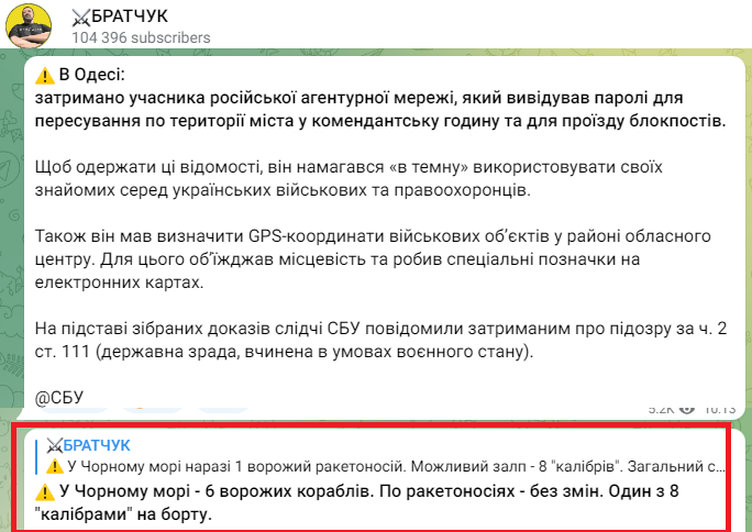Раніше вранці Братчук повідомляв про один ворожий ракетоносій у морі з можливим залпом до восьми «Калібрів». Загальний склад угруповання чф на бойовому чергуванні — 10 одиниць.
