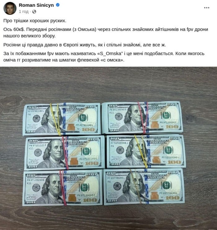Про трішки хороших руских. Ось 60к$. Передані росіянами (з Омська) через спільних знайомих айтішників на fpv дрони нашого великого збору, — зазначив він.