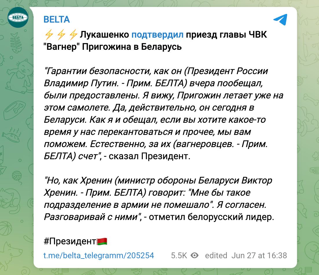 https://racurs.ua/n184529-lukashenko-zayavil-chto-prigojin-uje-v-belarusi.htmlРакурсСамопроголошений президент білорусі, диктатор олександр лукашенко підтвердив приїзд ватажка ПВК «Вагнер», воєнного злочинця рф євгенія пригожина. Він заявив, що пригожину надані «обіцяні путіним гарантії безпеки».