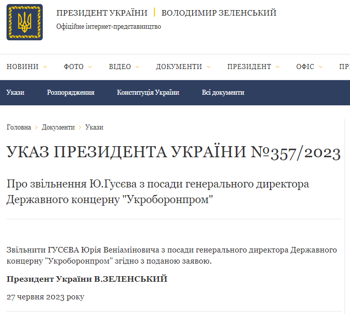 https://racurs.ua/n184540-guseva-uvolili-s-doljnosti-glavy-ukroboronproma-zelenskiy-podpisal-ukaz.htmlРакурсЮрія Гусєва звільнили з посади генерального директора концерну «Укроборонпром» — президент Володимир Зеленський 27 червня підписав відповідний указ.