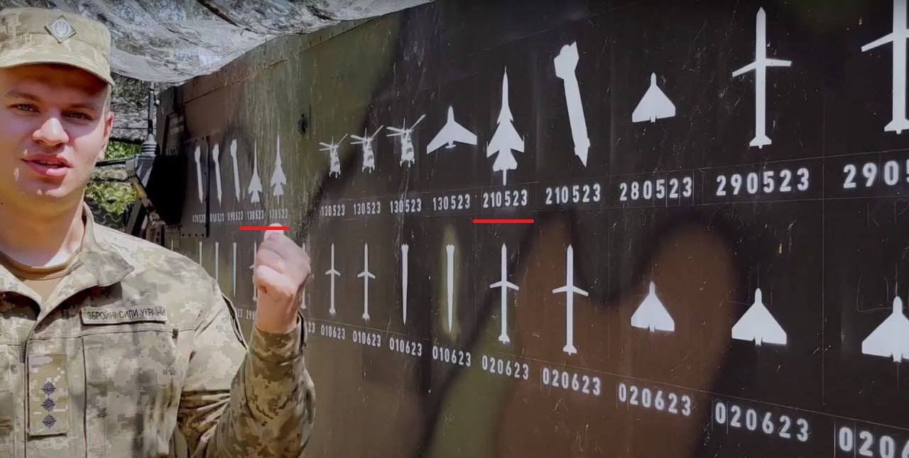 У списку збитих цілей останньої ЗРК через трафарет написано 13.05.2023, над цим написом — два літаки, три вертольоти та безпілотник літакового типу.