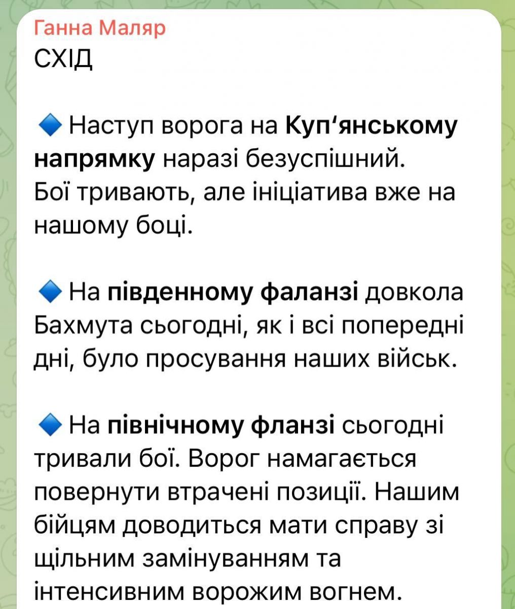З її слів, на південному фаланзі довкола Бахмута сьогодні, як і всі попередні дні, зафіксовано просування наших військ. На північному фланзі тривали бої. Ворог намагається повернути втрачені позиції.