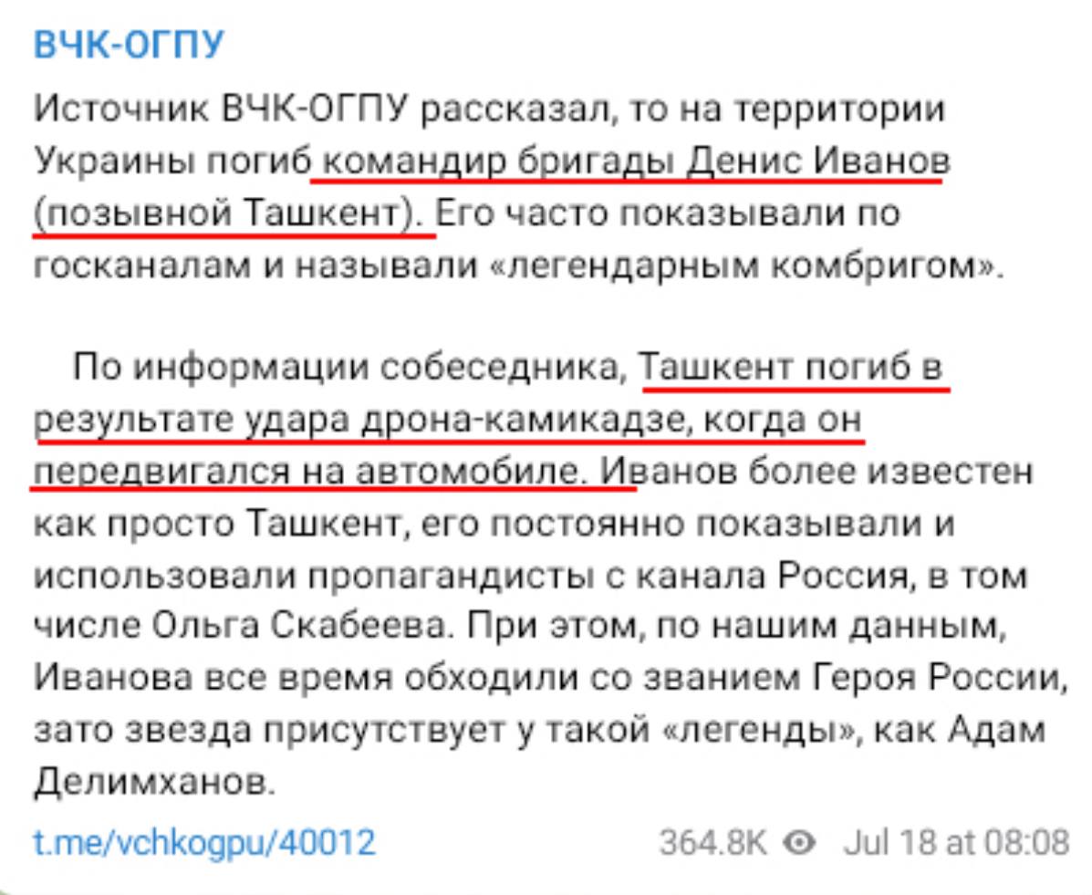 Російські канали офіційно підтвердили полковника Іванова, позивний Ташкент.