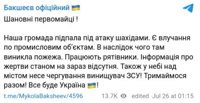 Наша громада підпала під атаку шахідами. Є влучання по промисловим обʼєктам, — розповів він у повідомленні, опублікованому о 01.15.