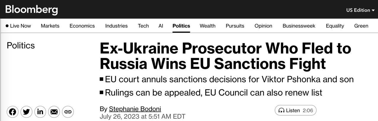 https://racurs.ua/n185503-pshonka-vyigral-sud-ob-otmene-sankciy-evrosouza-bloomberg.htmlРакурсКолишній генеральний прокурор України Віктор Пшонка, який утік до росії після усунення Віктора Януковича з посади президента України, виграв суд про виключення його зі списку санкцій Євросоюзу.